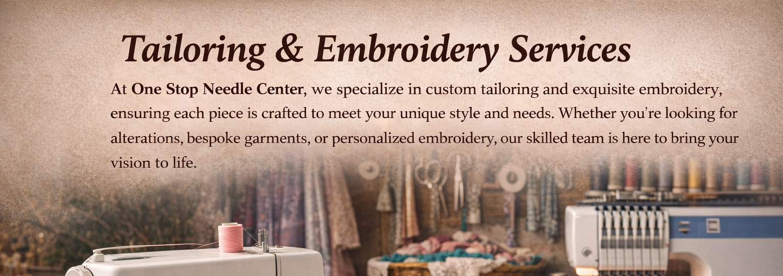 At One Stop Needle Center, we believe that every stitch tells a story. Nestled in the heart of our community, we specialize in tailoring and embroidery services that cater to your unique needs. Whether you're looking for a custom outfit for a special occasion or personalized embroidery to add a touch of flair to your everyday wear, our skilled team is here to bring your vision to life. We pride ourselves on our attention to detail and commitment to quality, ensuring that every piece we create is not just a product, but a cherished memory. Join us in celebrating the art of tailoring and let us help you express your individuality through our custom creations!